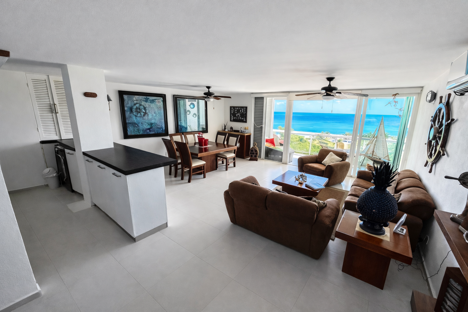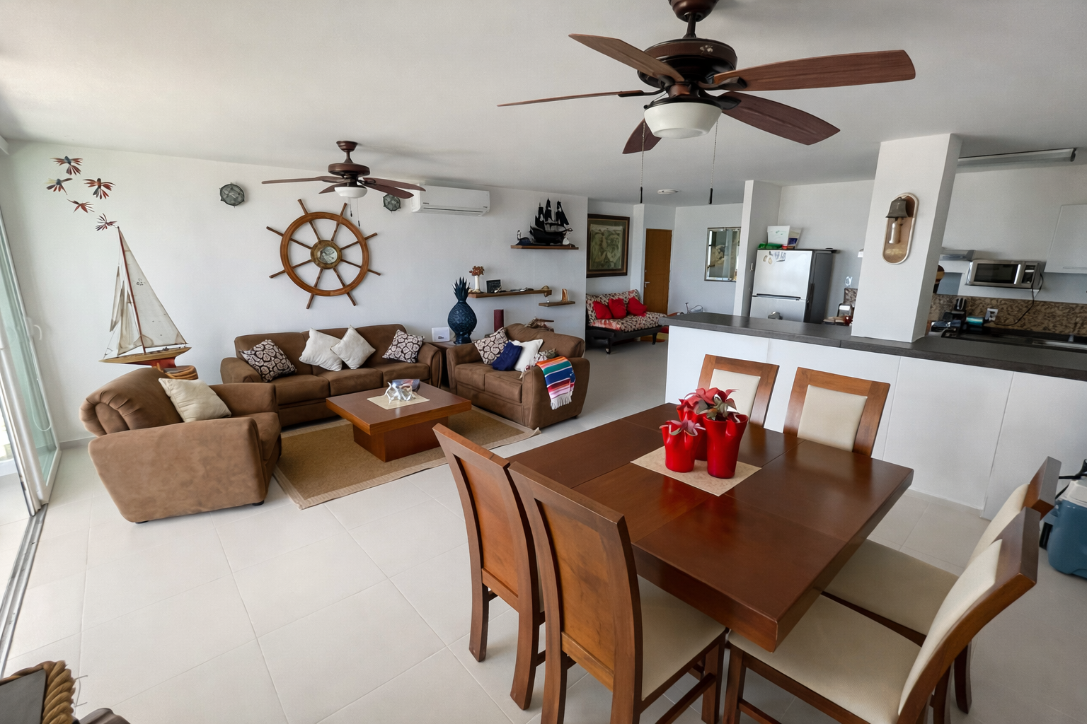 Acabados de lujo, decorado con una colección de arte mexicano y detalles náuticos: timones tallados, barcos a escala de gran detalle y elementos decorativos en azul cobalto que rinden homenaje al entorno marítimo. Los toques de textiles mexicanos (huipiles y mantas coloridas) aportan esa calidez de hogar.